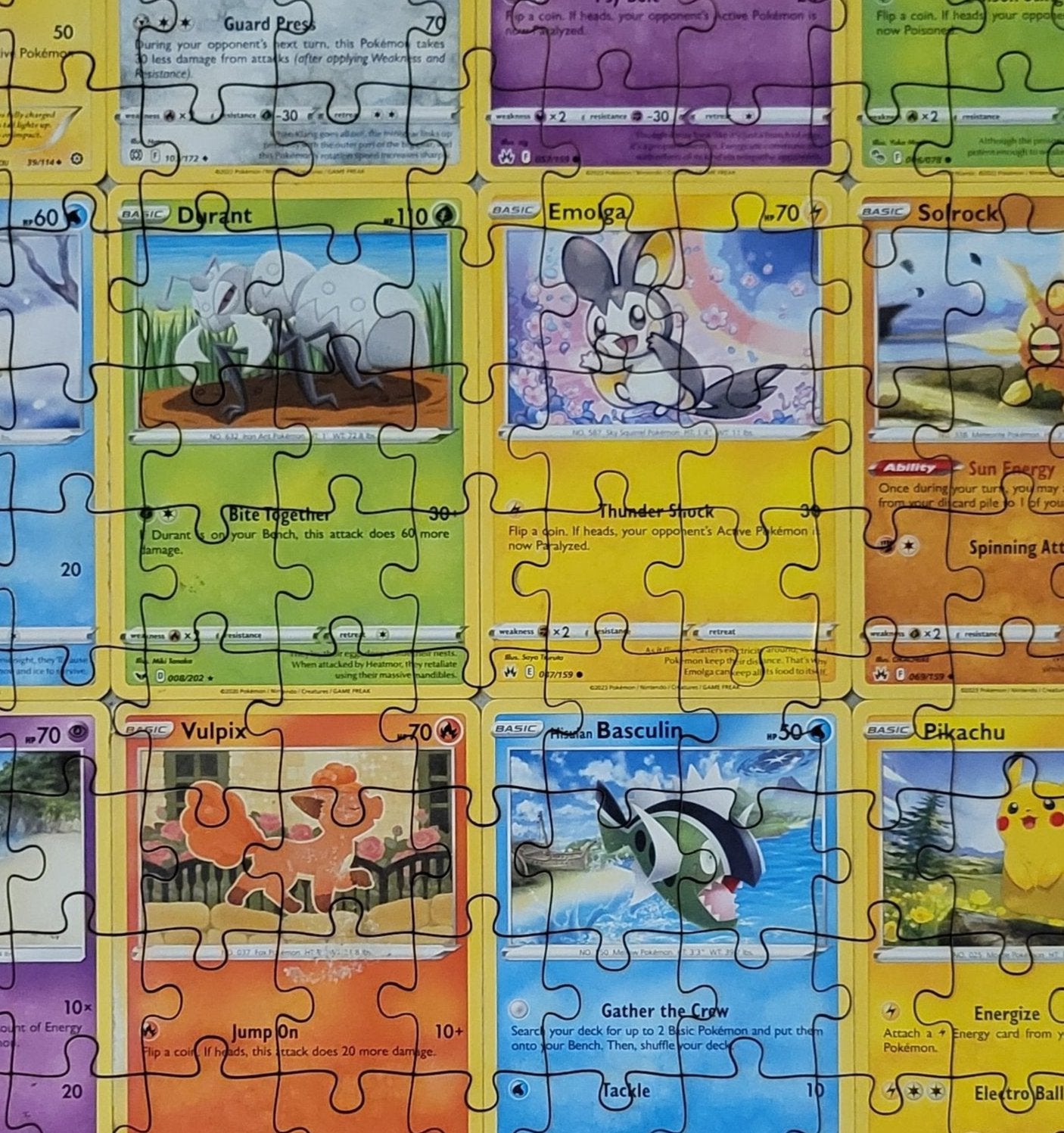 Experience Pokémon cards like never before! Piece together iconic Pokémon characters and scenes, combining your love for collecting with the fun of puzzling. Perfect for any Pokémon fan looking to catch them all in a new way