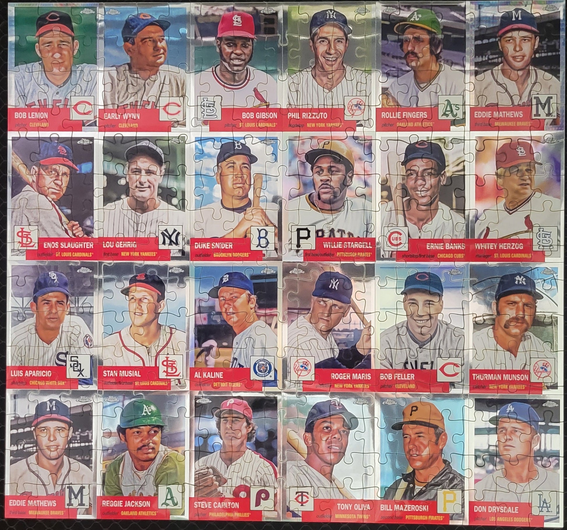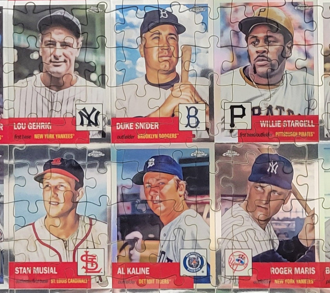 Gehrig, Oliva, Maris, Musial, Stargell, Gibson, Rizzuto, Kaline....many all Legends in Chrome fashion! featuring over 24 real trading cards of top MLB stars. With over 250 intricately cut wooden pieces, this puzzle offers hours of engaging fun and doubles as a collectible. Medium Skill Level.